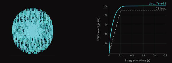 この非反復走査パターンでは、積分時間をあげることでFOV(視界)内の走査率を上げることが可能で、Tele-15では約0.1秒でFOV内の99.8%のFOV範囲を走査出来ると言う。これはリニア走査パターン(走査線数128本)で走査を完了する際にかかるのとほぼ同じ時間だ。(右グラフ参照)