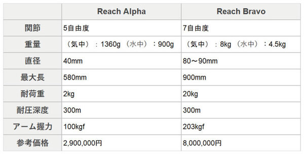 同時に、ROV(※)や水中ロボットに搭載可能な多関節アーム「Reach Alpha」および「Reach Bravo」の販売も開始。この低価格かつ高精度な水中ロボットアームは様々な環境に対応できるため、過酷な水中作業リスクを大幅に減らすことができる。