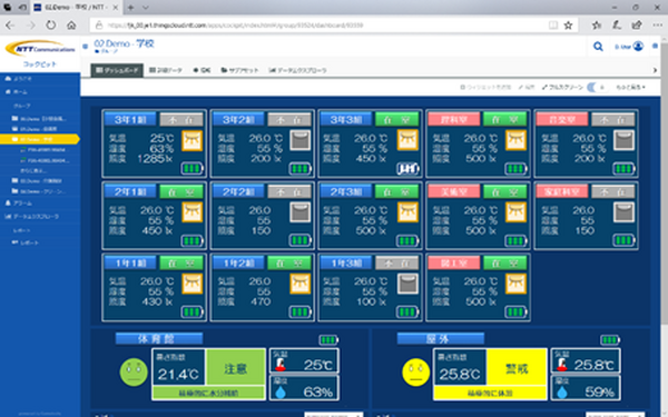 これらのセンサノードを対象箇所に敷設するだけでは熱中症予防施策につなげることは難しい。具体的なアクションにつなげるためにはセンサ情報を統合し、「みえる化」するアプリケーションも必要だ。今回はフジクラが開発したクラウドアプリケーションを用いることで、インターネットを介して、センサノードを設置している複数拠点からの現在及び過去の暑さ指数データを、管理端末画面上でいつでもどこでも閲覧することができるようになった。