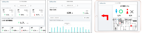 エレベーターホールやビル内施設の混雑状況、気温・湿度といった環境情報等あらゆるデータをオフィスワーカー向けに配信。「利便性・快適性の向上」「業務効率化」に加え、リアルタイムデータに基づいた混雑回避を可能にする。