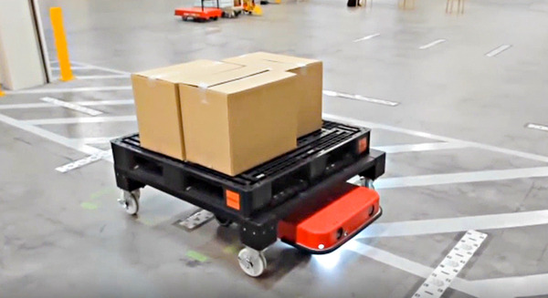 「CarriRo」シリーズの最初は、人の後ろを追尾する追従型だったが、自律移動システムを搭載した台車型自動搬送ロボット「CarriRo AD」を開発。更に改良した「CarriRo AD+」はパレット台車の下に潜り込んでパレットを持ち上げ、床面に貼ったマーカーシールを読んで指定された目的に自律移動するシステムを搭載した。