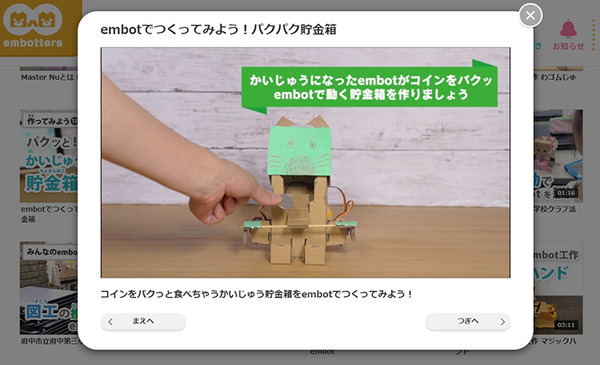 NTTドコモが開発したダンボールロボットのプログラミング教育キット「embot」(エムボット)。今回は「embot」の楽しみ方を拡げるウェブサイト(ホームページ)「embotters」(エムボッターズ)を紹介します。実際に全国の小学校でembotを使って行われた授業の様子を見たり、ロボットのデコレーションの例、いろいろなセンサーとの連携などが動画で楽しめます。更には大人のロボスタ読者必見なのはシュールなチャレンジ動画「Master Nu」シリーズ。巨大なembot、空飛ぶembotなど、シュールな実験動画がを楽しむこともできますよ。