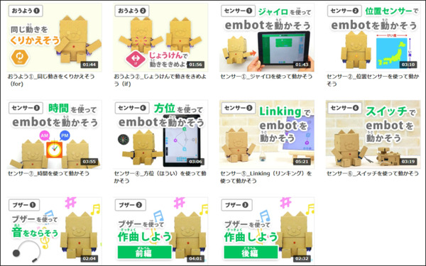 「これからembotを作る」「embotを作るのに困ったことがある」という人は「最初にやってみよう」をチェックするとよいでしょう。ダンボールロボットの組み立て方、embotアプリでロボットを動かすための準備、プログラミングの基本が動画で紹介されています。
