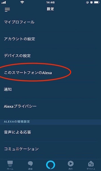 Alexaアプリを開き、設定メニューに移動。メニューから「このスマートフォンのAlexa」を選択する。