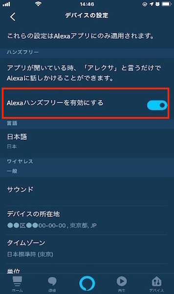 「このスマートフォンのAlexa」から、ハンズフリーのオンとオフを切り替え、画面の指示に従って、マイクと位置情報のアクセス権限を許可する。