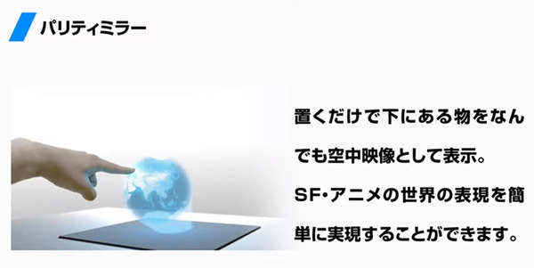 次世代映像技術「空中映像・空中ディスプレイ」の研究開発を行っている(国)情報通信研究機構発のベンチャー企業である同社は2010年に設立。ただ置くだけで空中映像を浮かび上がらせる新しい光学素子「パリティミラー」を世界で初めて開発することに成功した。パリティミラーの量産化、大型化、さらにそれを用いた応用システムの試作などの様々な光学素子の実用研究/システム開発を行っており、、国内外で開催される展示会・見本市を通じて空中映像の応用・普及を促すと同時に、今までにない画期的なディスプレイツールとしてパリティミラーを用いた応用システムを開発し、その魅力を最大限に訴求している。