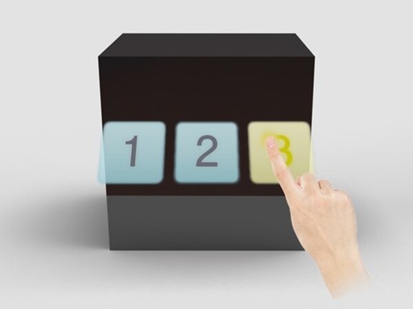 ただ置くだけで空中映像を浮かび上がらせる新しい光学素子「パリティミラー」によって空中に画像や映像を表示させることができる。これを、センサーと組み合わせることにより、空中に浮かんだ画像に触れることで反応する非接触スイッチへの応用が可能となった。