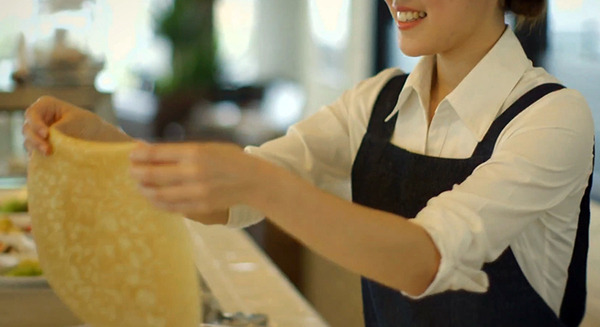 ボタンひとつで調理が難しいクレープ生地の焼き上げを自動で行う。さらに、焼き上げ後の生地の取出しまで行うため、クレープ生地焼き職人が居なくても、スタッフが盛付けを行う事で焼き立てクレープを提供する事が出来る。