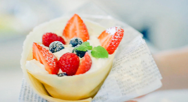 クレープロボットQが作ったクレープ生地に、スタッフが具材を盛り付け完成、美味しそう!