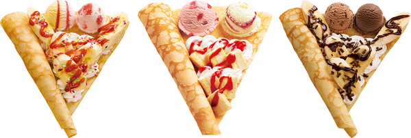 左)カラフルいちごバナナ&アイスクリーム、中)ストロベリーベイクドチーズケーキ&アイスクリーム、右)チョコバナナ&アイスクリームクレープ