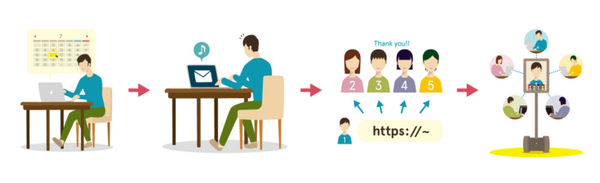 webサイトやアプリの予約ページカレンダーから、空き時間を選択して予約。予約すると視聴URLがメールで発行される。