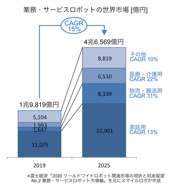 富士経済によると、2025年の業務・サービスロボットの世界市場は4兆6,569億円の予測で、2019年比で2.3倍(年平均成長率:CAGR 15%)と大幅な成長が見込まれている。中でも搬送用の領域はCAGR 31%と、最も大きい伸び率を示している。(富士経済の2020 ワールドワイドロボット関連市場の現状と将来展望 No.2 業務・サービスロボット市場編より)