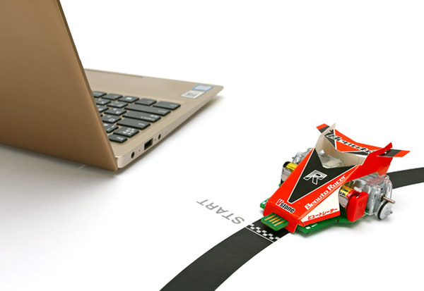 ビュートレーサーは、中学校の新学習指導要領「プログラミングによる計測・制御」に対応したロボットカータイプの学習教材。プログラムしたものを実際に動くロボットで確認することにより、プログミラングの概念だけではなく、実際の結果からプログミラングを理解することができる。また、プログミラングの学習に必要な資料を無償で公開しているため、初心者でも安心して取り組める。