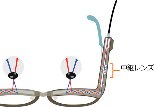 そこで今回発表した構造ではディスプレイユニットをこめかみに配置し、導光板までの間に中継レンズを通すことで表示することが出来る設計にしている。