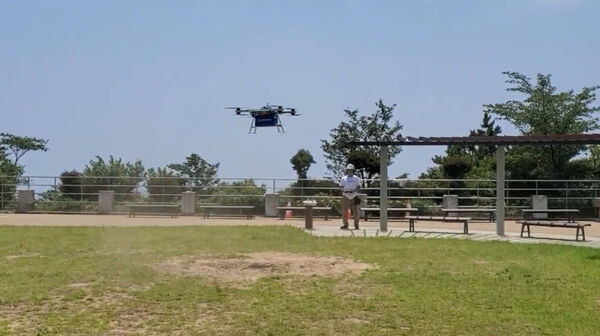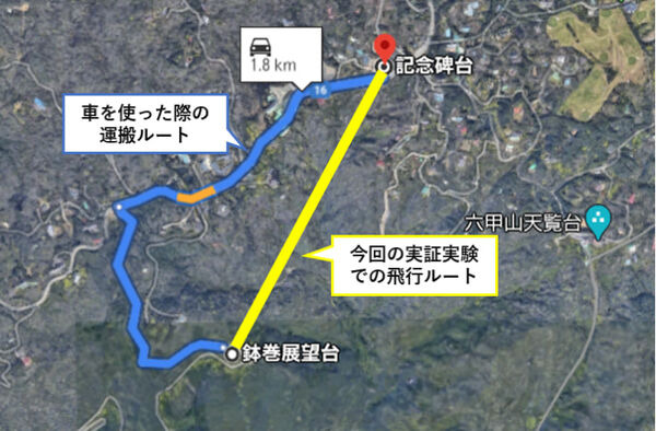 実証実験ではカーゴドローンが荷物(小売店商品、飲食物(米飯、洋菓子)、医薬品)を抱え、兵庫県神戸市灘区鉢巻展望台~同灘区六甲山記念碑台の区間を飛行。