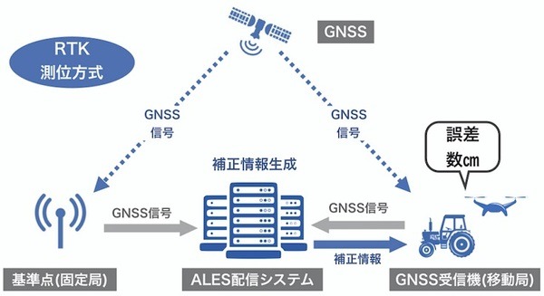 同社が提供する「センチメートル級測位サービス」は、ソフトバンクの独自基準点(固定局)が受信した信号などを基に、「ALES配信システム」で補正情報を生成し、ユーザーのGNSS受信機(移動局)へインターネット経由で補正情報を配信するNtrip方式のサービスだ。この補正情報と、GNSS受信機が受信した信号を活用してRTK測位(固定局)と移動局の2つの受信機を使ってリアルタイムに2点間で情報をやりとりすることで、高精度での測位を可能にする。誤差数センチメートルの高精度な測位が可能、としている。