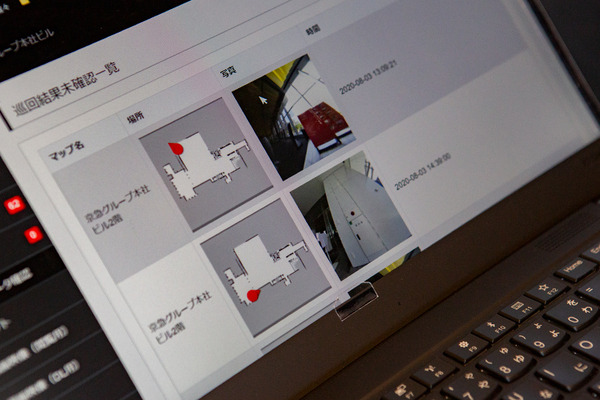 作成した3Dマップと超音波センサーと組み合わせることで超近距離にある障害物も感知し衝突を回避できる。遠隔管理者は災害センターからロボットを操作。画面のマップ上で目的地や周回コースを指定するだけで、「SQ-2」は人やモノを避けて目的地や周回ポイントに向けて自走ルートを計算して移動する。目的地や周回ポイントで撮影し、災害センターの管理者は各写真をチェックして、消火器などチェックする次項の確認を行ったり、出入り口や非常口の周囲に不審物や放置ベビーカーなどの有無をチェックすることができる。