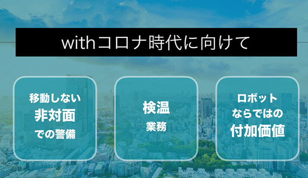 今回の実証実験では、巡回・立哨警備、遠隔スタッフとの会話による案内等が行われる。デモではさらに「ugo」による検温作業が公開された。