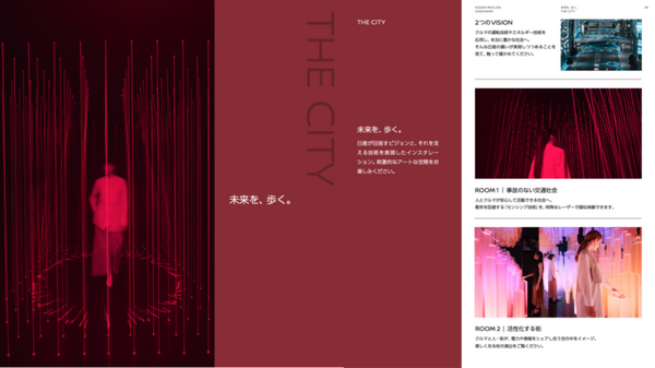 日産自動車が目指す「交通事故の無い社会」。そして、クルマに乗っている時も乗っていない時もクルマと街がより便利につながる社会。その双方の実現に必要なセンシング技術やクルマからエネルギーや情報が行き渡る様子をモチーフに、ビジュアルデザインスタジオのWOWがデジタルインスタレーション作品に仕上げた。フォトジェニックな空間に没入しながら、直感で作品とコミュニケーションできる。