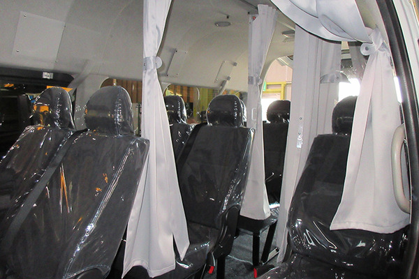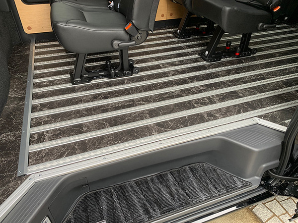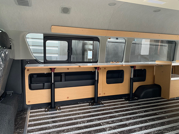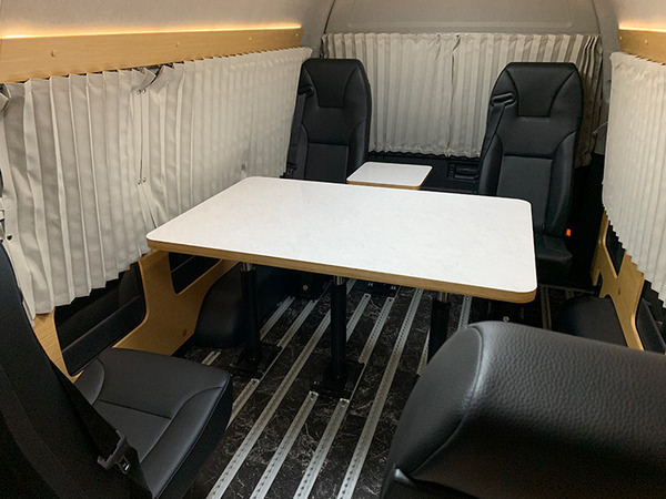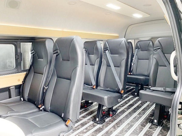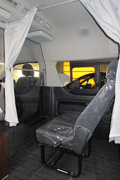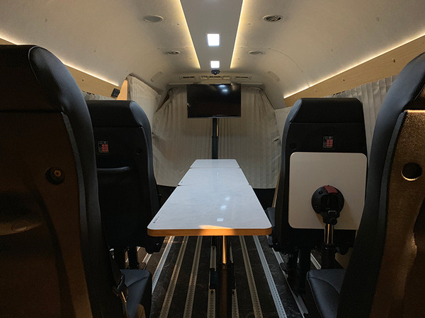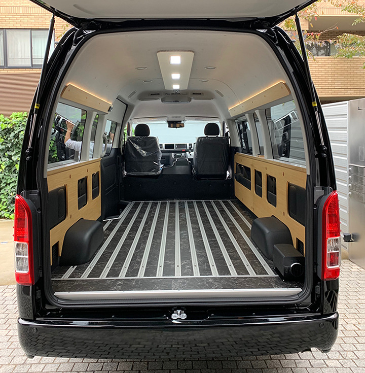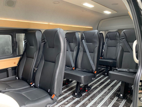 架装内容 | <標準装備>フロアレール(後部)、専用シート(後席8席)、LED室内照明、USBポート(後部5カ所)、専用リアヒーター <オプション>テーブル、24インチモニター、カーテン(全面)、専用内装パネル、空気清浄機など |