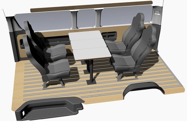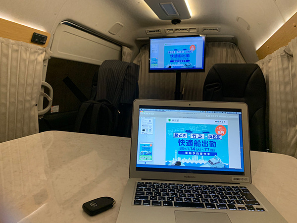 「マルチタスク車両」は、複数のレールを活用した専用フロア構造(意匠登録済み)により、後席の取り外しや移動、テーブルの設置(駐車時に限って使用可能)などを、工具を使わずに自由に行える架装車両だ。オンデマンドバスとしての活用だけではなく、電源や照明、テーブル、モニターなど(一部オプション)を装備しているため、移動先での商談スペースやオフィスとしての利用、物販や行政サービスの提供など、さまざまな用途で活用することができる。車内のレイアウトを変更することで、1台の車両を曜日や時間帯によって使い分けることも可能だ。