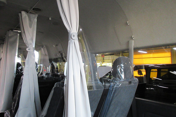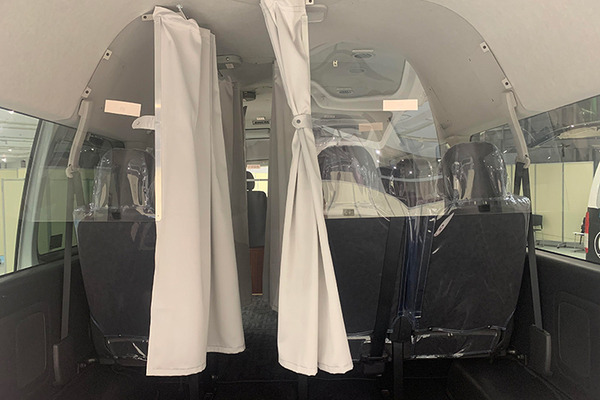 座席間に隔壁やカーテンなどを設置することで、パーソナルな空間をつくり、ドライバーや乗客同士の接触を極力少なく、また、同社が独自に開発した強制換気の仕組み(特許出願中)により、各後席の天井から外気を取り入れ、後方へ流して排気することで、常に新鮮な空気に入れ替えることが可能だ。その他、乗客の体表面温度を測定する非接触式測定器を装備している他、乗客の降車後にドライバーなどが容易に清掃を行えるよう、後席にはビニールシートカバーを装着している。