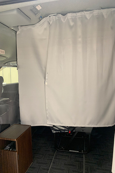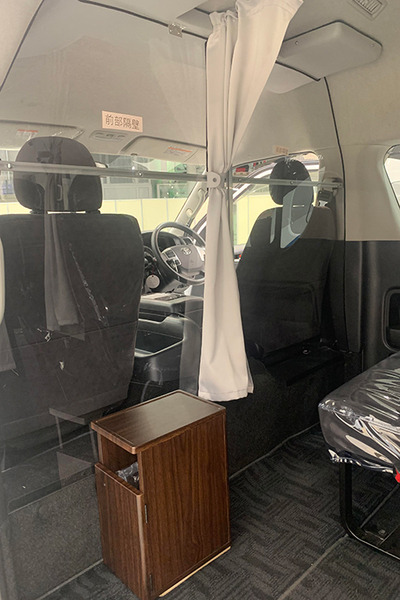 架装内容 | 前席・後席間の隔壁、後席の個別隔壁・カーテン、強制ベンチレーションシステム、ビニールシートカバー(後席のみ)、後席インターホン(5席)、体表面温度を測定する非接触式測定器、専用ダストボックス |