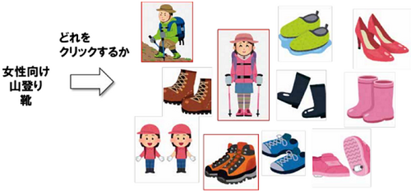 同部門は、オンラインショップの商品検索で、サイトユーザーが入力した文から、ユーザーがクリックする商品の画像を当てる手法を開発するものだ。 (検索文入力の例:「女性向けの山登り用の靴」のように、複数の単語で構成されている文) ドコモは、翻訳などの言語処理で広く使われている「BERT」というディープラーニングの手法を改良し、 画像に含まれる物体と検索文中の単語を結び付けられるAIを開発。そのほか、画像に含まれる物体の種類を表す単語の情報を用いて、検索文と画像の対応関係を学習するAIを開発した。これらの複数のAIを使うことで、高い精度でクリックする商品の画像を特定することに成功した。