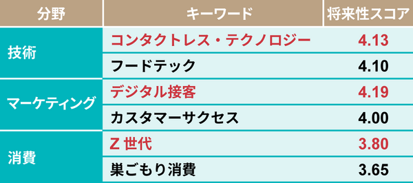 また、今回の調査から新たに下表の6つのキーワードを追加した。これらの中で、将来性スコアが比較的高かったのは、技術分野の「コンタクトレス・テクノロジー」「フードテック」、マーケティング分野の「デジタル接客」、消費分野の「Z世代」だった。
