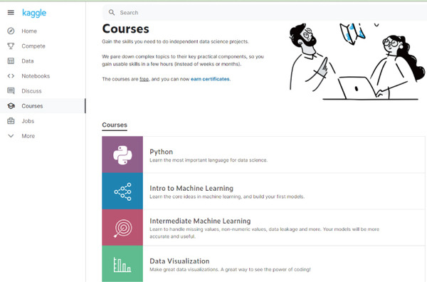 Kaggleにも基礎的なPython、機械学習、ディープラーニング、空間情報分析など、多様な学習コースがあるが、英語なので敷居が高い。