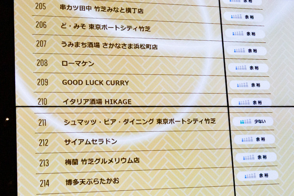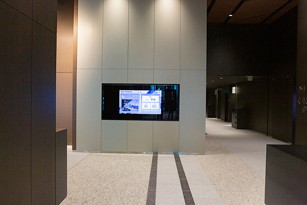 館内にはいたるところに大型のサイネージやタッチパネルがあり、店舗の混雑情報、テラスの温度や空き状況、周辺の鉄道など交通情報、天気情報などが表示されている。タッチパネル式のものはそれらの情報を来館者が選択することができる。
