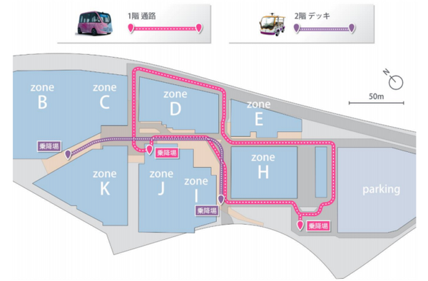 ルート | 1階通路バスプールから、ゾーンH、I、J、K、C、D、E、F、Gの順に巡回 |