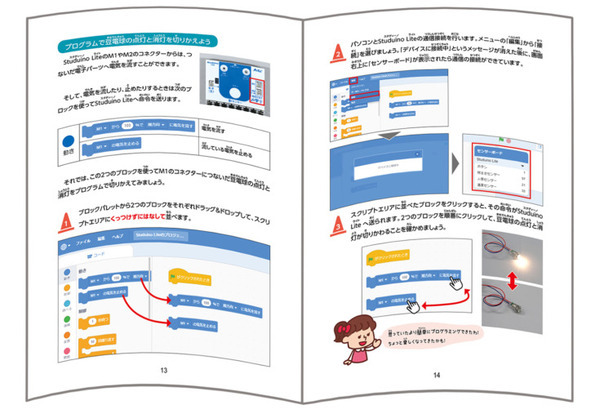 キットには全76ページの入門ガイドブックが付属。プログラミングの文法だけでなく車の自動ブレーキシステムや人感ライトなど、コンピューターが使われている身近な電気製品の仕組みをわかりやすく学ぶことができる。