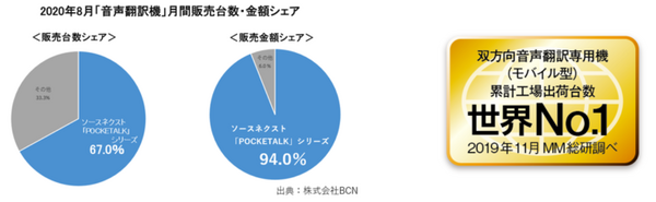 2017年12月の発売以来、「ポケトーク」シリーズ(初代、「ポケトーク W」、および「ポケトーク S」を含む)の累計出荷台数は、2020年2月25日時点で70万台を突破、8月度の音声翻訳機カテゴリで、販売台数シェア67.0%(対前月比 18.0%増)、金額シェア94.0%(対前月比 5.5%増)となり、初代モデルの販売開始から販売台数、金額シェアともに、33ヶ月連続で第1位を獲得している。(出典:株式会社BCN 音声翻訳機カテゴリ)