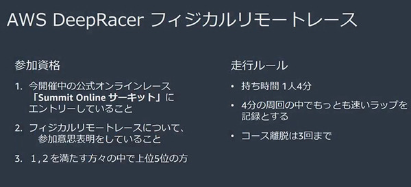 2020年もDeepRacerによる「AWS DeepRacerリーグ」が開催されている。現在開催中のオンラインレース「AWS Summit Online サーキット」にエントリーしている参加者の中で、フィジカル リモート レースに参加表明していることが参加の条件で、更にその中から上位5名が選出され、この「AWS DeepRacer フィジカル リモート レース」に出場した。