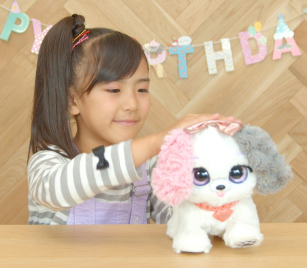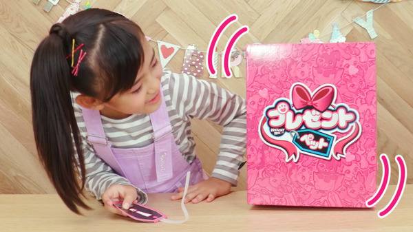 「プレゼントペット」はユーザーがプレゼントボックスのタグを引くと、プレゼントボックスがひとりでにガタガタとゆれながら破れ、やがて仔犬が中から自ら出てくるという“家族との新しい出会い”とお世話やゲーム、おしゃべり遊びを通してコミュニケーションを楽しむことができる新感覚のペットトイ。