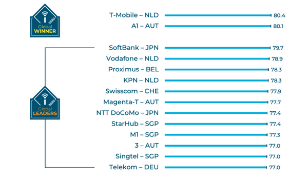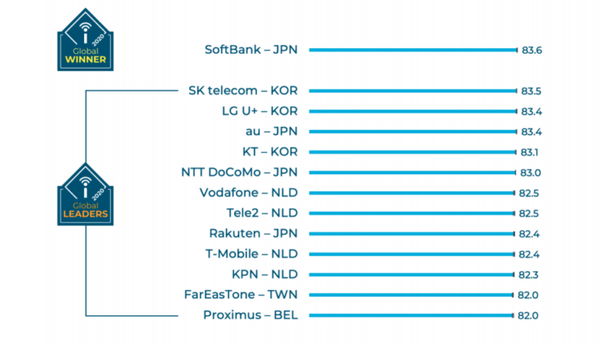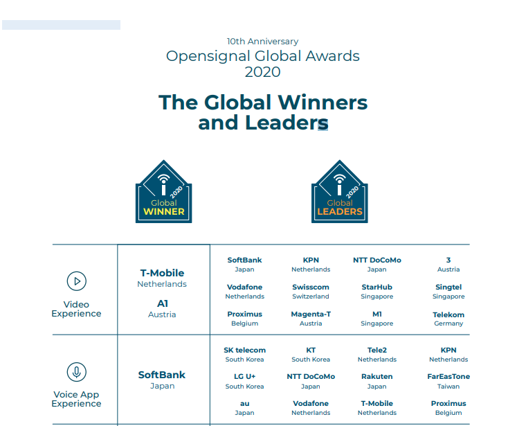 T-Mobile NetherlandsとオーストリアのA1は、ビデオエクスペリエンスの共同グローバル受賞者であり、ユーザーが100点満点中80ポイントを超える平均ビデオエクスペリエンススコアを報告した唯一の企業。ソフトバンクはアジア太平洋地域におけるユーザーのモバイルビデオ体験で最高のパフォーマンスを発揮した。なお、日本勢ではドコモが9位で続いた。