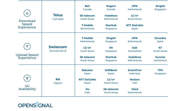 日本のモバイル市場の新参者である楽天は、音声アプリエクスペリエンスと4G利用率の両方でグローバルリーダーであり、同業他社とは異なり、アップロード速度エクスペリエンスのグローバルハイパフォーマーとなった。