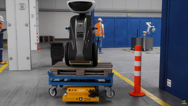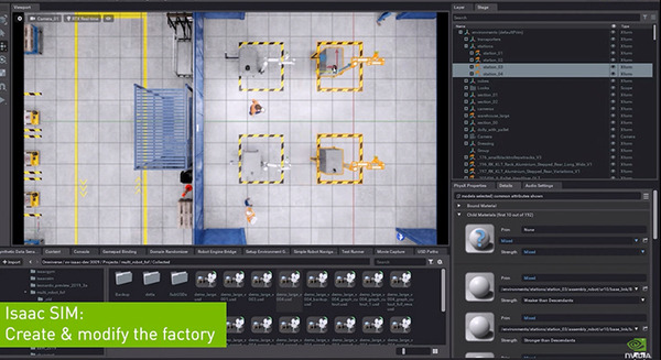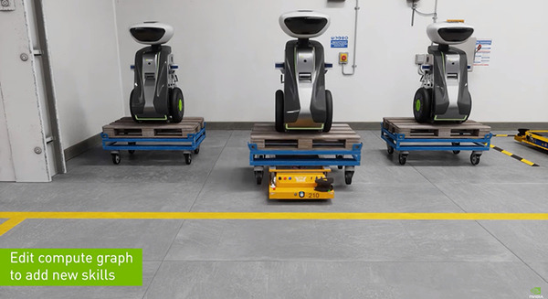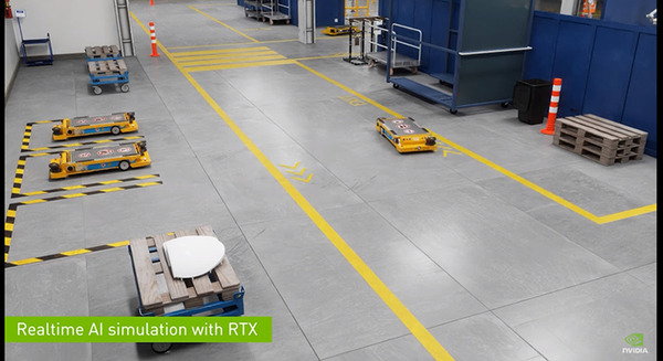 「このシミュレーションは、将来のファクトリーを示したものです。このロボットたちはIssac Stackの中で動いていて、リアルタイムにファクトリーと他のエージェントと繋がっています」と語った。