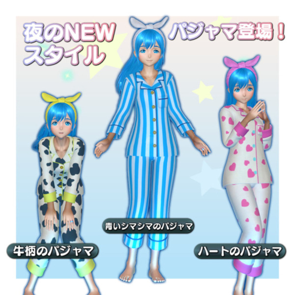 ヒカリが用意したパジャマは「青のシマシマパジャマ」、「牛柄のパジャマ」、「ハートのパジャマ」の3種類。なお、今回ヒカリが新しく用意したお洋服が「パジャマ」、今まで夜に着ていた金のファスナーのお洋服が「ルームウェア」となる。ヒカリに着替えを頼む時は、着てもらいたい服の名前を正確に伝えよう。
