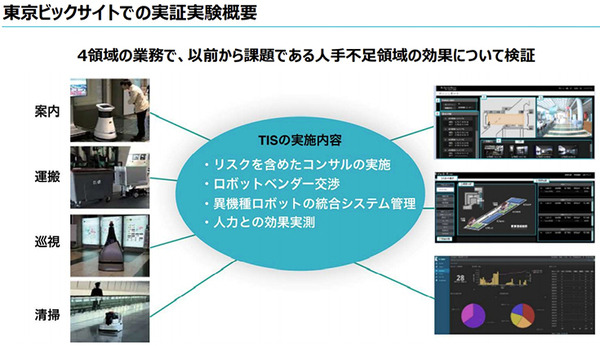 実証実験の事例としては東京ビッグサイトと羽田のHICityに参画したケースを紹介。東京ビッグサイトでは、案内、運搬、巡視(警備)、清掃の4分野でロボット導入の有効性を検証した。