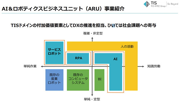 その中にあって、AI&ロボティクスビジネスユニット(ARU)事業は、単純で定型だった従来のロボットやコンピュータ、BI事業から、知的で複雑、非定型の事業の業務をにらみ、ロボティクス、RPA、AIを展開している。