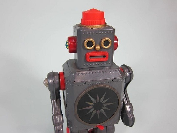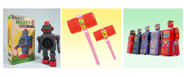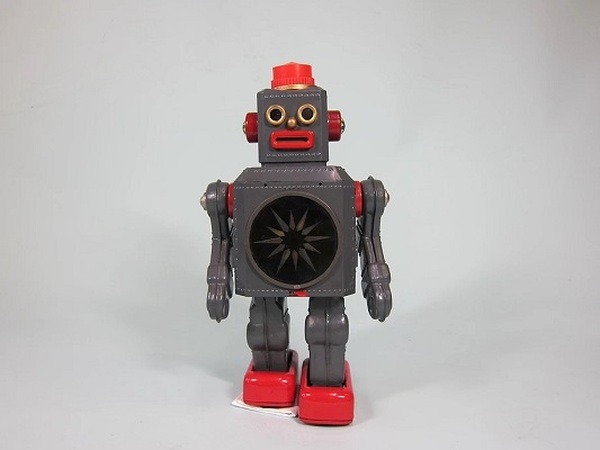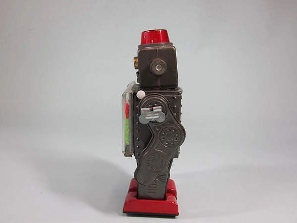 同社が1964年に発売した全長約30㎝の「マイティ―8」は、電池で動く、金属玩具(ブリキのおもちゃ)だ。腕を振り、交互に足を動かして歩き、胸から赤・緑・黄色の光を発する。