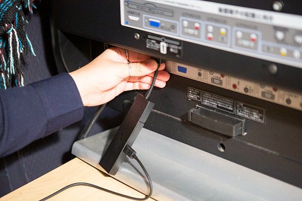 HDMI延長ケーブルは、テレビのHDMI端子が奥まったところに設置されていたり、端子の周囲にスペースがないなど、Fire TV Stick本体を直接挿せない場合に使用します。HDMI端子にHDMI延長ケーブルを挿して、ビロンと出てきたこのケーブルの端子にFire TV Stick本体を挿すわけです。