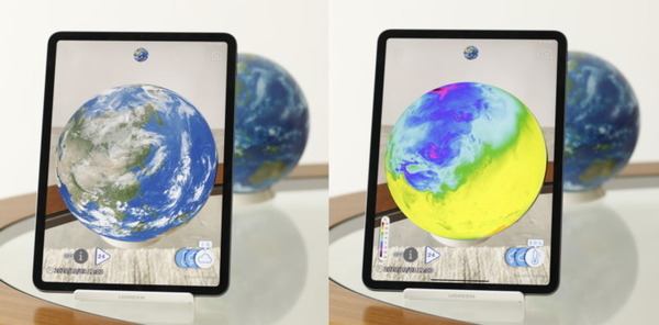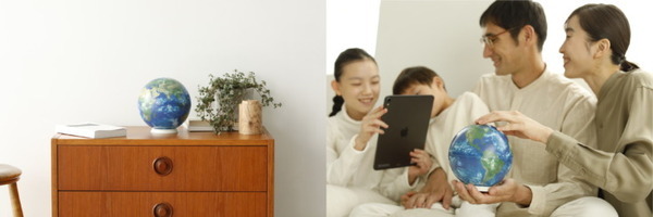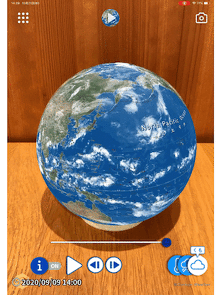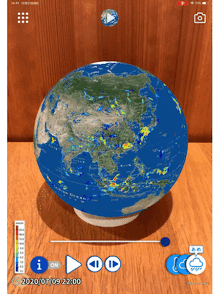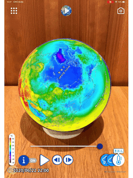 今回のアプリリニューアルによって、「いまの地球」と「一週間の地球」を見ることができる。アースボールにスマホやタブレットをかざすと、地球上で刻々と変化する「雲・雨・気温」のデータが、1時間おきにリアルタイムで更新されて映し出される他、一週間分の「雲・雨・気温」の変化もさかのぼって見ることができる(アプリはiOS、Androidに対応)。