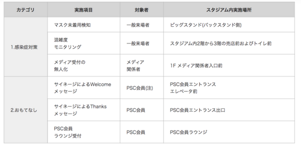 実証実験では一般来場者向けの感染症対策として、映像分析技術を用いた観戦時におけるマスク未着用の検知と、売店前およびトイレ付近での混雑度モニタリングを実施する。いずれもリアルタイムでモニタリングを行い、マスク未着用者をシステムが検知した場合には、スタッフがマスクの着用を案内する。対象エリアの混雑度の値を超えた際もシステムが検知し、スタッフが誘導することで混雑緩和を促し密状態の回避を実現する。また、メディア向けには事前に顔情報を登録した人を対象に顔認証技術とサーマルカメラを組み合わせることで、来場受付と体表温度の測定を非接触かつスムーズに実現する。