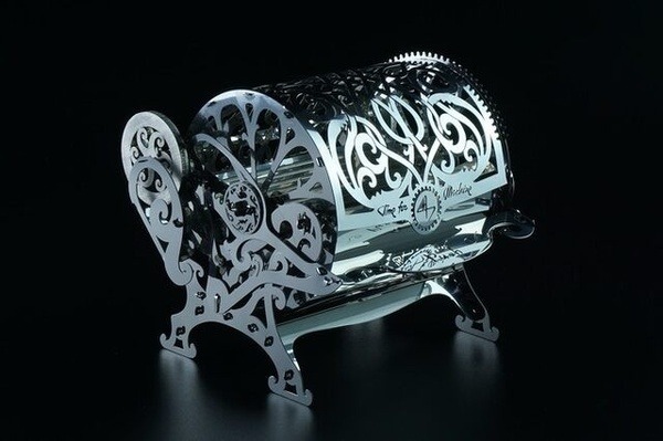 機械仕掛けの美しい箱です。Pushキーを押すと、ホイールが回転し、蓋が開きます。重みのあるものを入れると、自動的に蓋が閉じます。