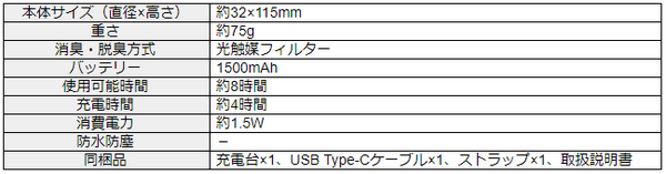 同製品はカルテック株式会社が独自に開発した光触媒技術を用いた、首にかけられる新しいタイプの空間除菌・脱臭機。人が1分間に呼吸する空気量は約7リットルとされており、これと同等の清浄した空気量を顔の周りに送る風量に設定されている。