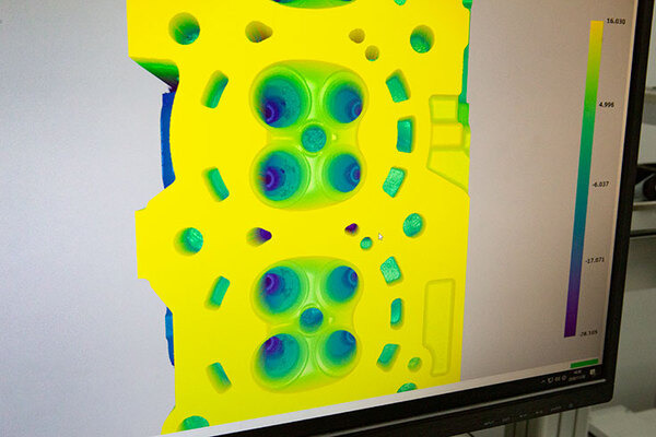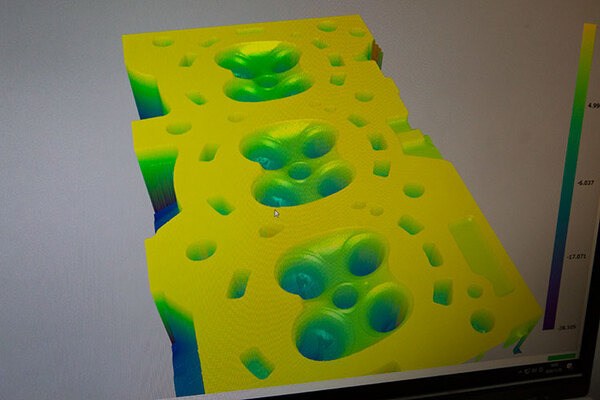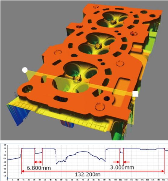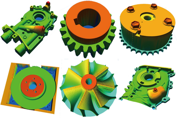 また、1秒間に50万点を測定できる高速技術を開発し、下図のような複雑な形状も光で非接触の計測が可能となった。例えば、エンジンのシリンダーヘッドやブロック、タービンなど曲がりくねった形状の部品も高精度でかつ高速に、全数計測することもできるという。特に傷やバリなど、わずかな凹凸の検知も得意だ。