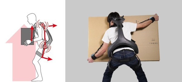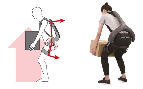 床面付近から腰の高さでの荷物の持ち上げ下げの際に、腰の負担を軽減するパワードウェア。